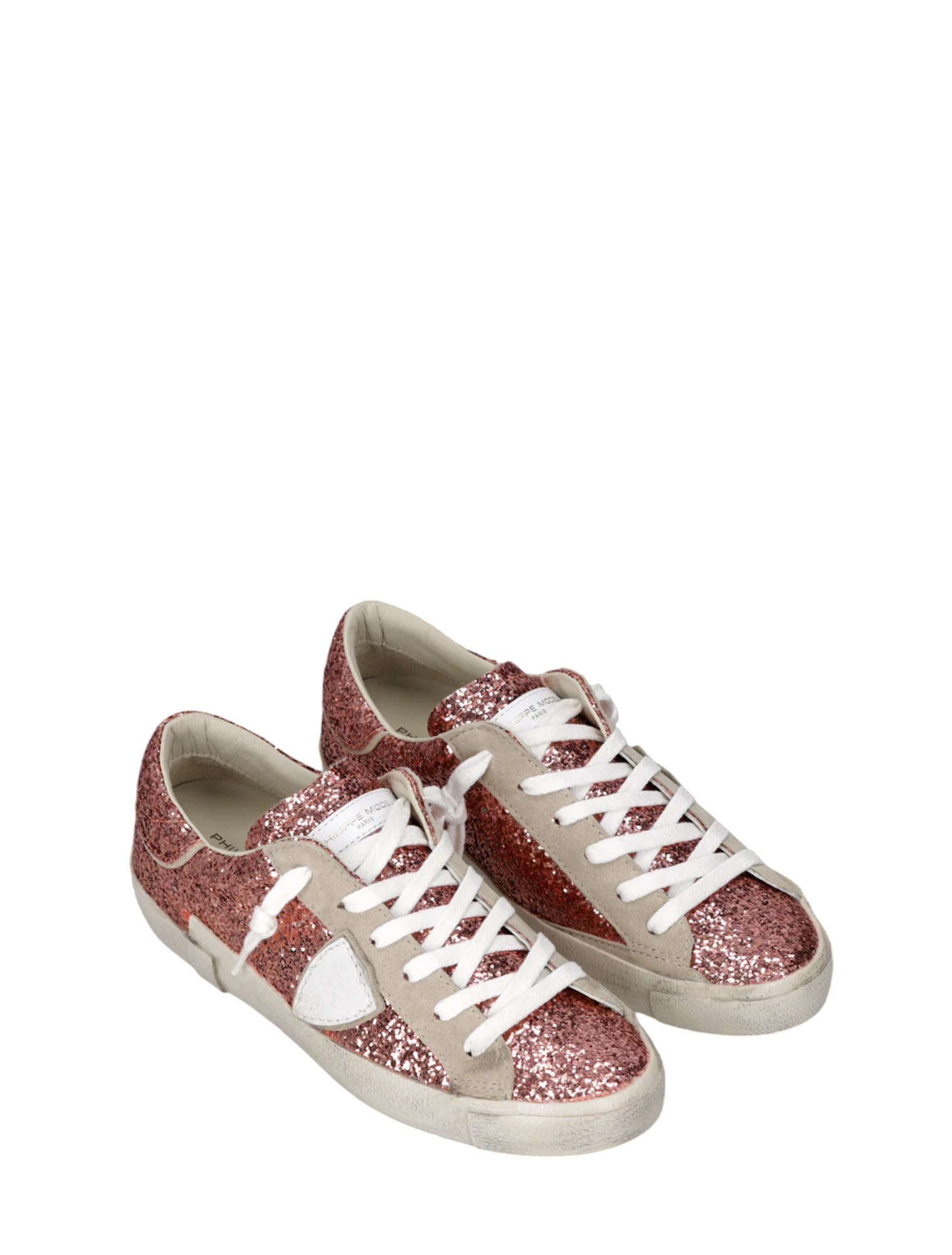 Sneaker bassa con tomaia total glitter, scudetto bianco e passalacci in suede. Fodera interna in spugna di cotone e pelle, soletta in schiuma estraibile.