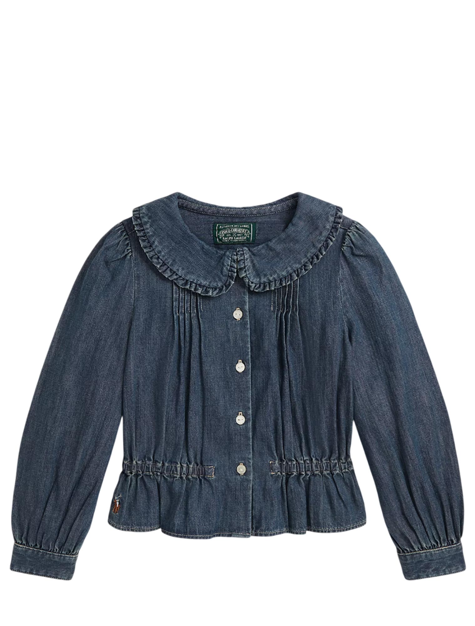 Colletto alla Peter Pan oversize con finitura di volant. Cannoncino con bottoni.