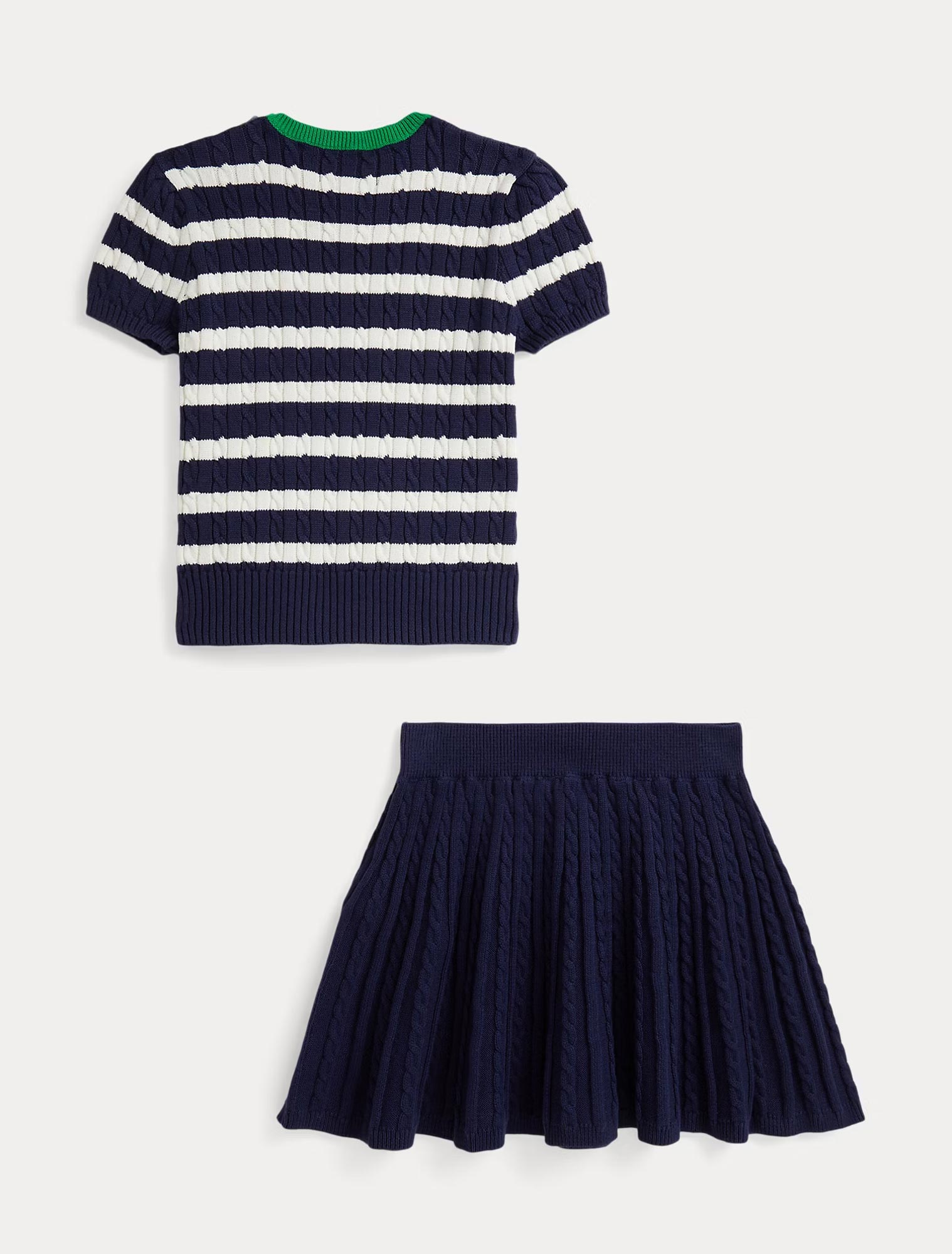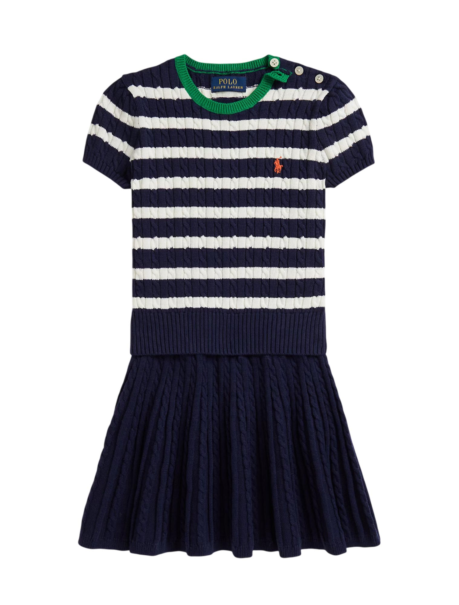 Maglia: esclusivo pony ricamato sul lato sinistro del torace, girocollo, chiusura a tre bottoni sulla spalla sinistra, maniche corte a sbuffo con fondo manica con lavorazione a coste, orlo con lavorazione a coste.