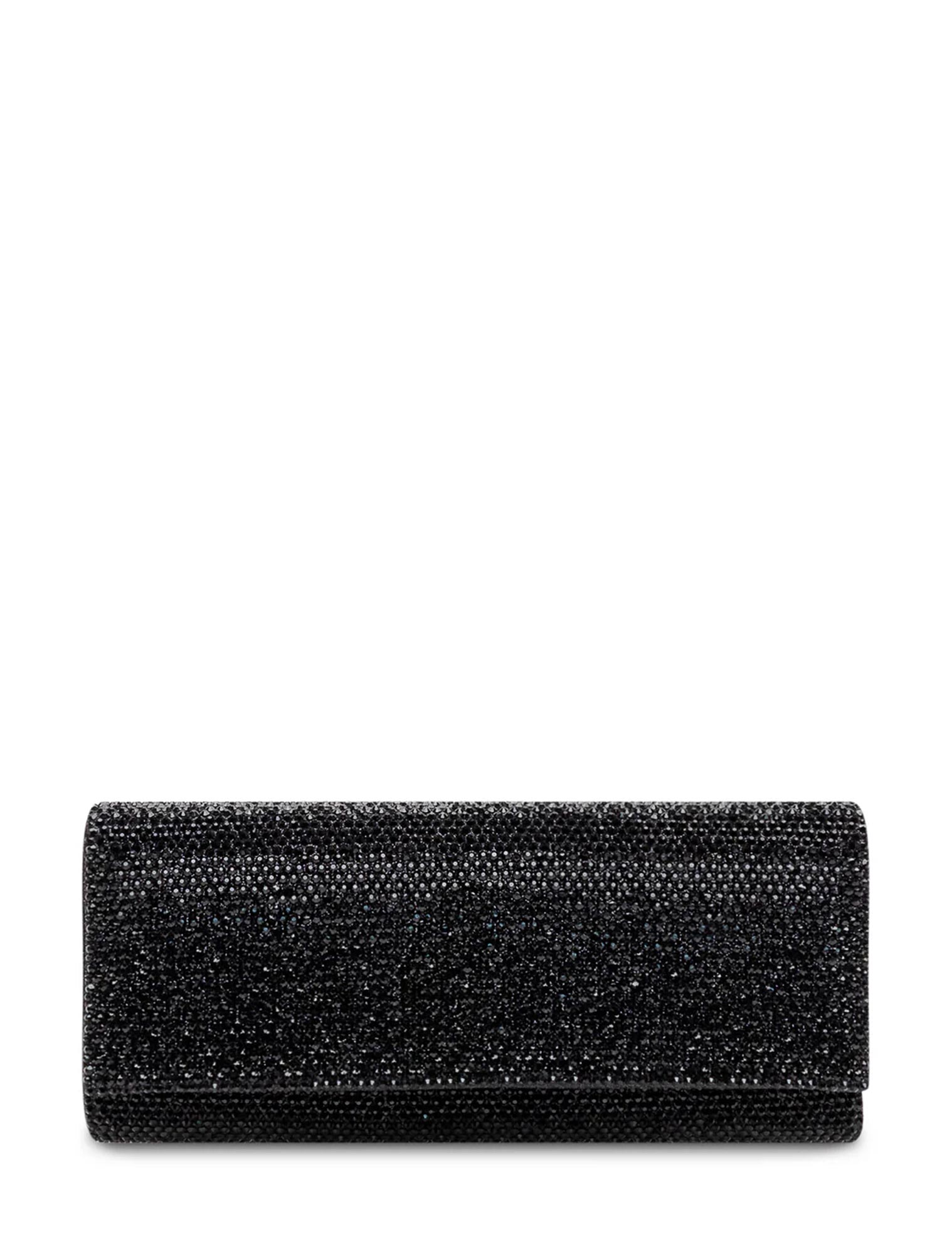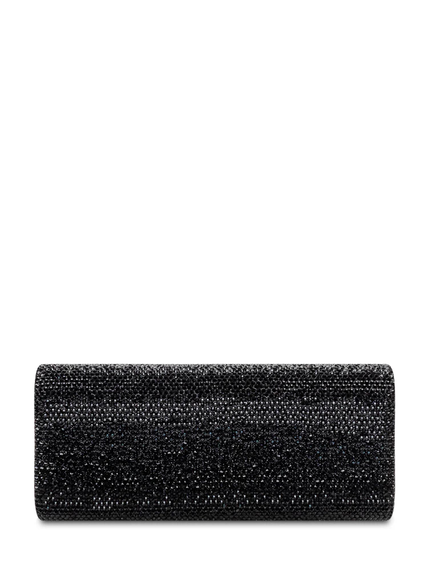 Pochette rigida rivestita di micro strass con silhouette rettangolare, patta con chiusura a scatto.