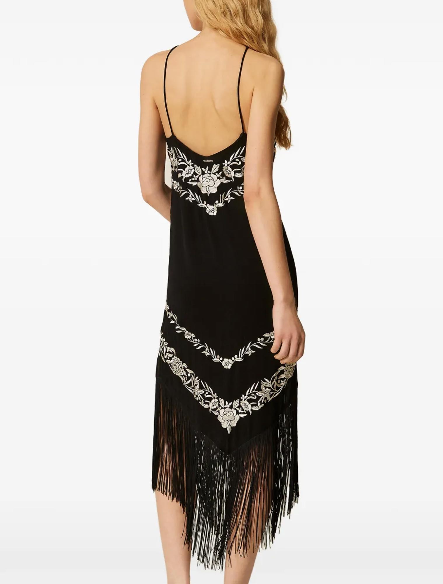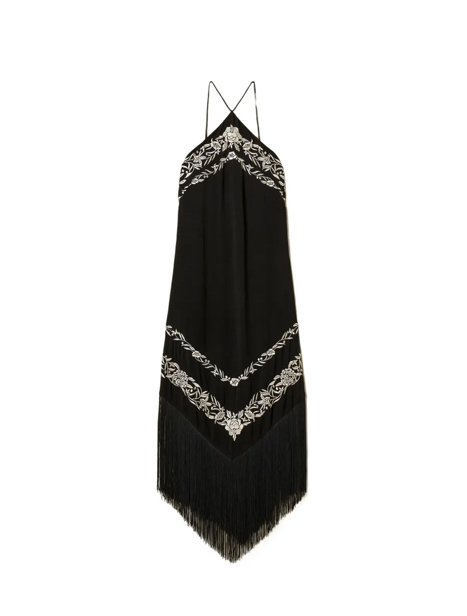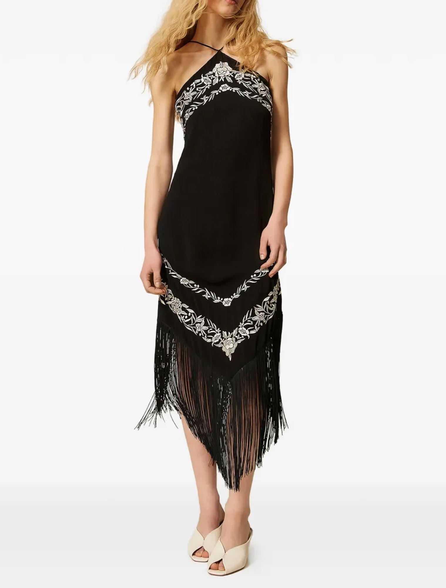 Abito lungo in viscosa con ricamo floreale piazzato a contrasto e frange a punta davanti e dietro. Ha spalline da annodare sul retro del collo, scollatura halter, chiusura con zip al fianco, linea slim.