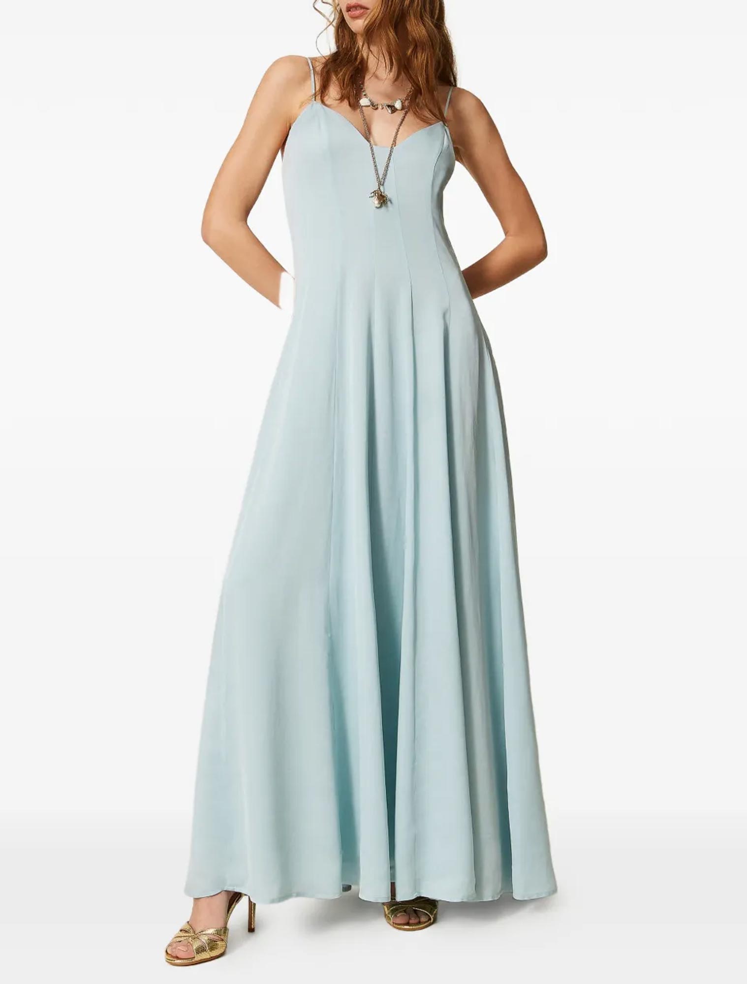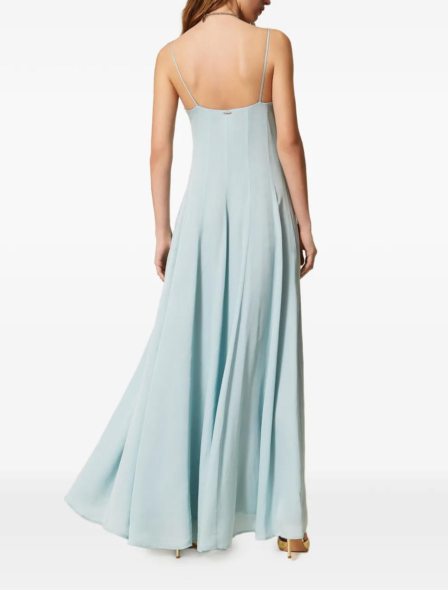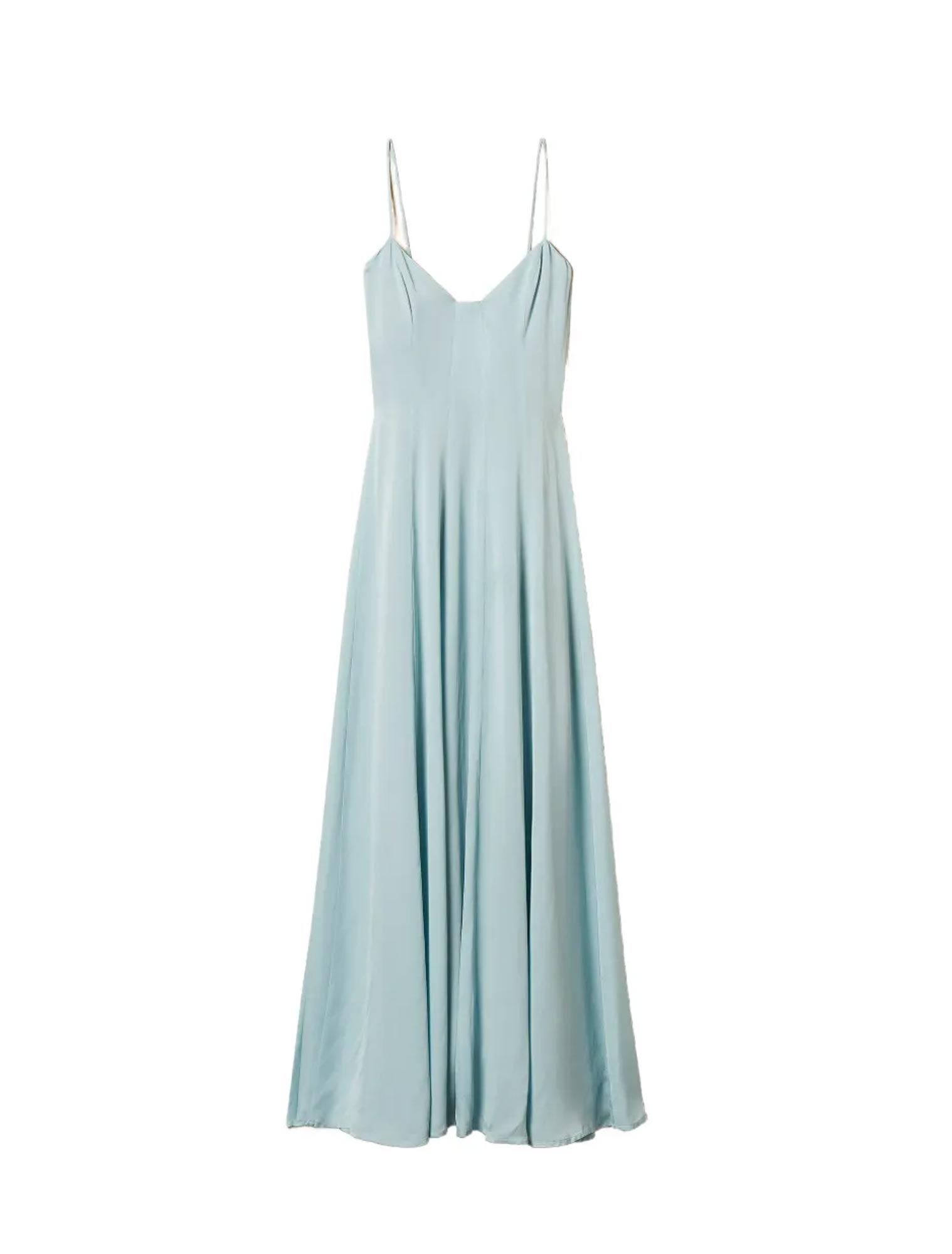 Abito lungo in raso di viscosa. Ha spalline sottili, chiusura con zip al fianco, fodera, linea fit & flare.