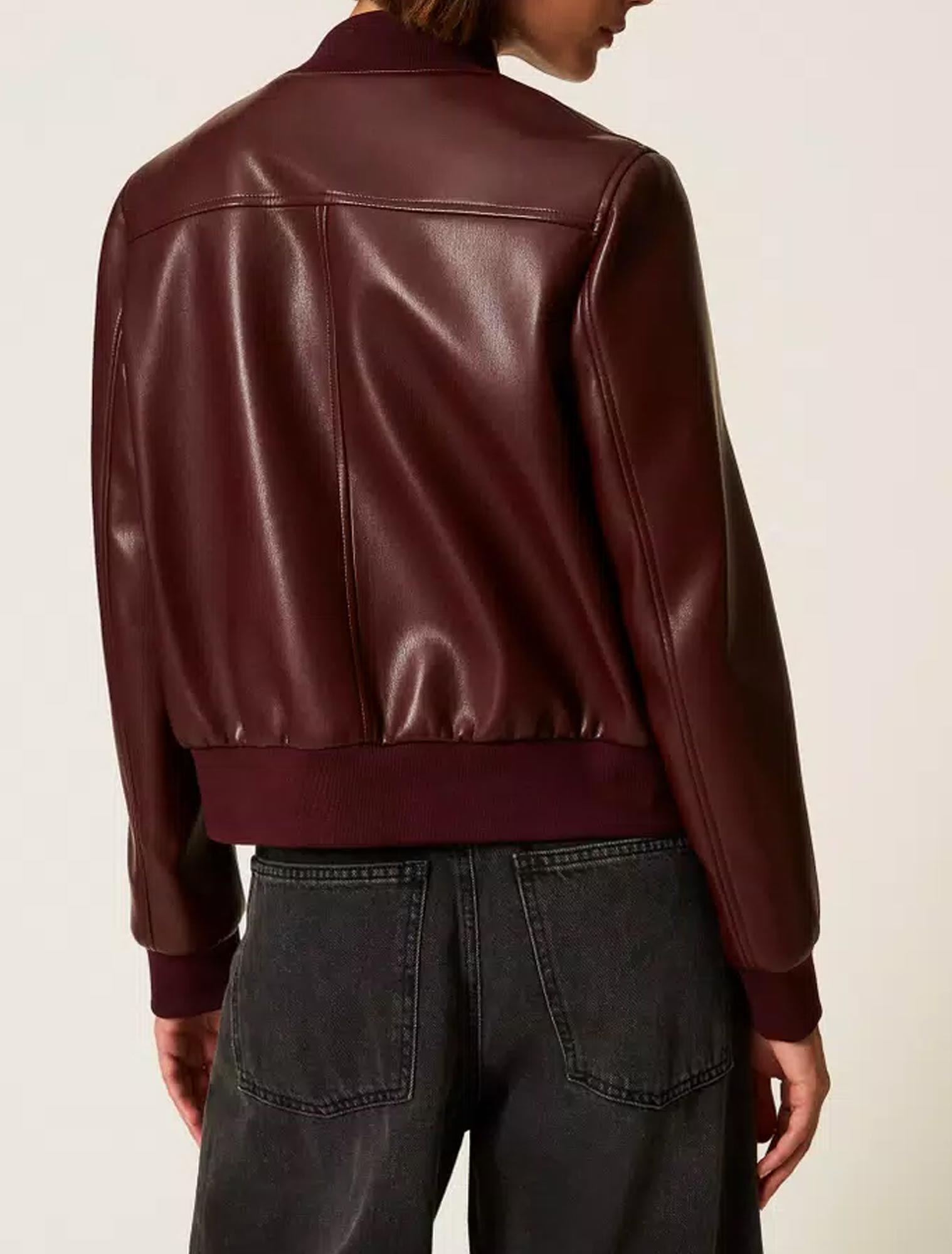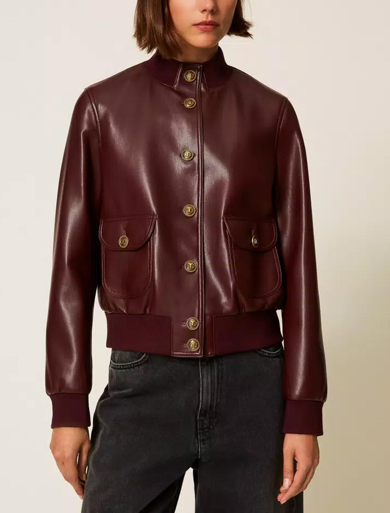 Giacca effetto pelle con bottoni a pressione logati Oval T. Ha profili in costina, maniche lunghe, tasche applicate con patta e bottone, fodera, linea dritta