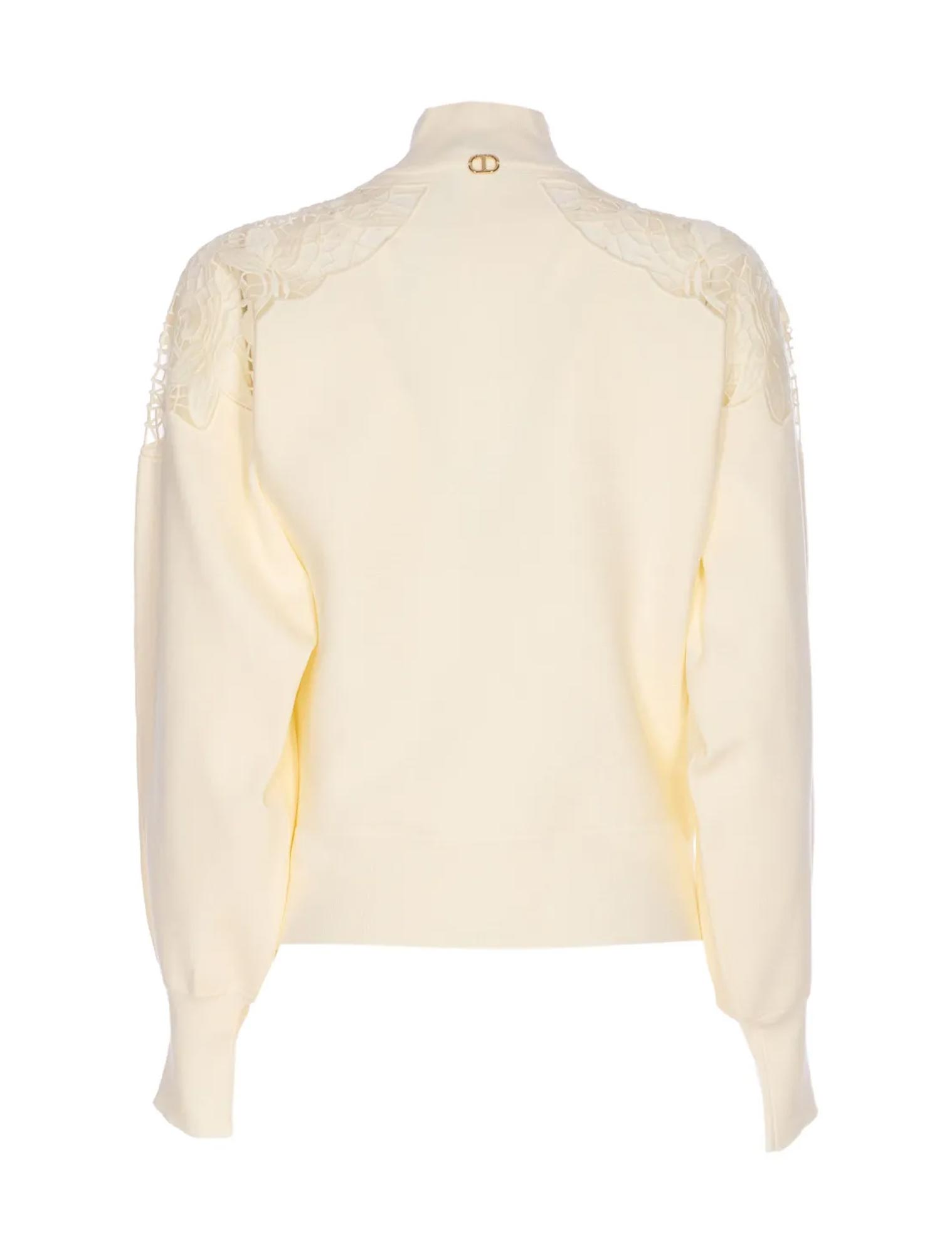 Giacca in maglia di misto viscosa con lavorazione rasata e inserto sulle spalle in organza ricamato a ramage. Ha collo a lupetto, maniche lunghe, chiusura con zip davanti, profili rifiniti a costine, linea morbida.