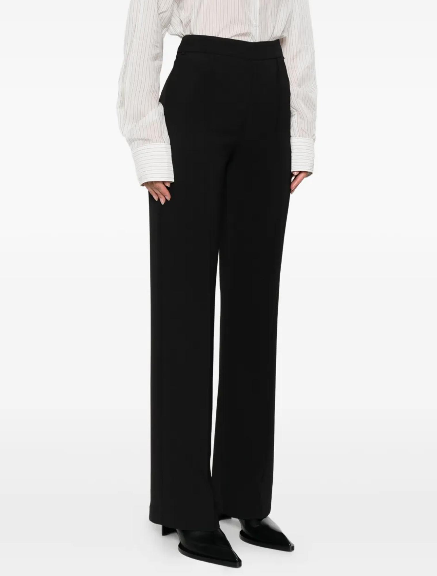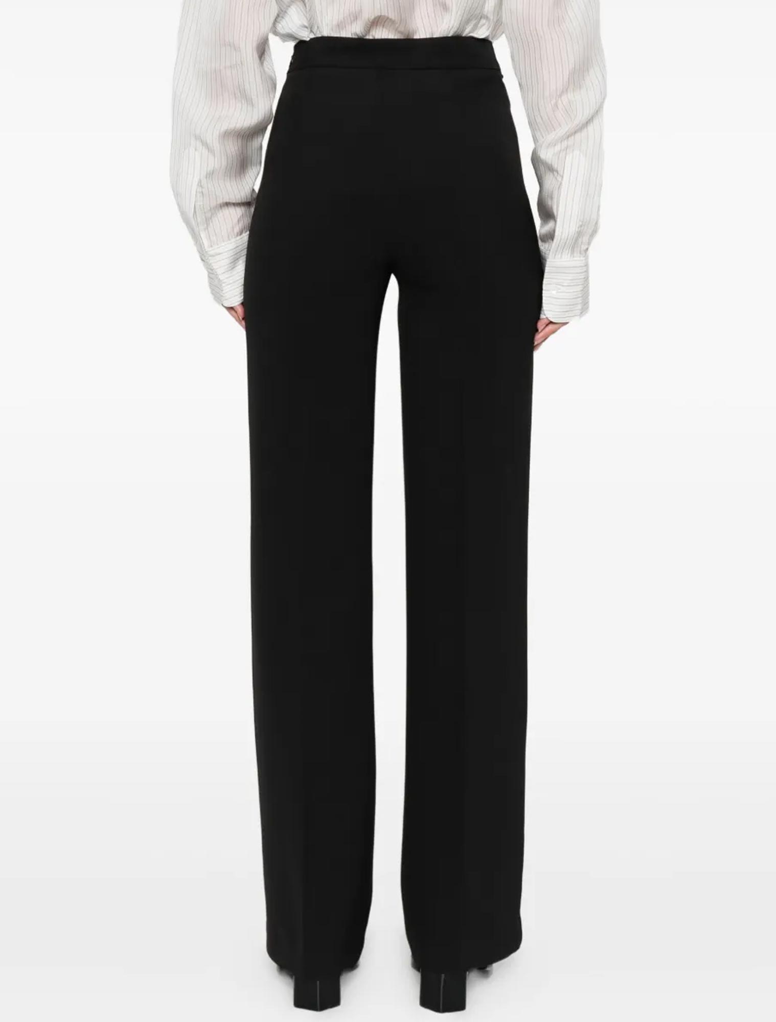 Pantaloni in crêpe cady con cintura rimovibile in catena davanti e dettaglio Oval T. Ha chiusura con zip invisibile al fianco, nervatura centrale, linea a palazzo.